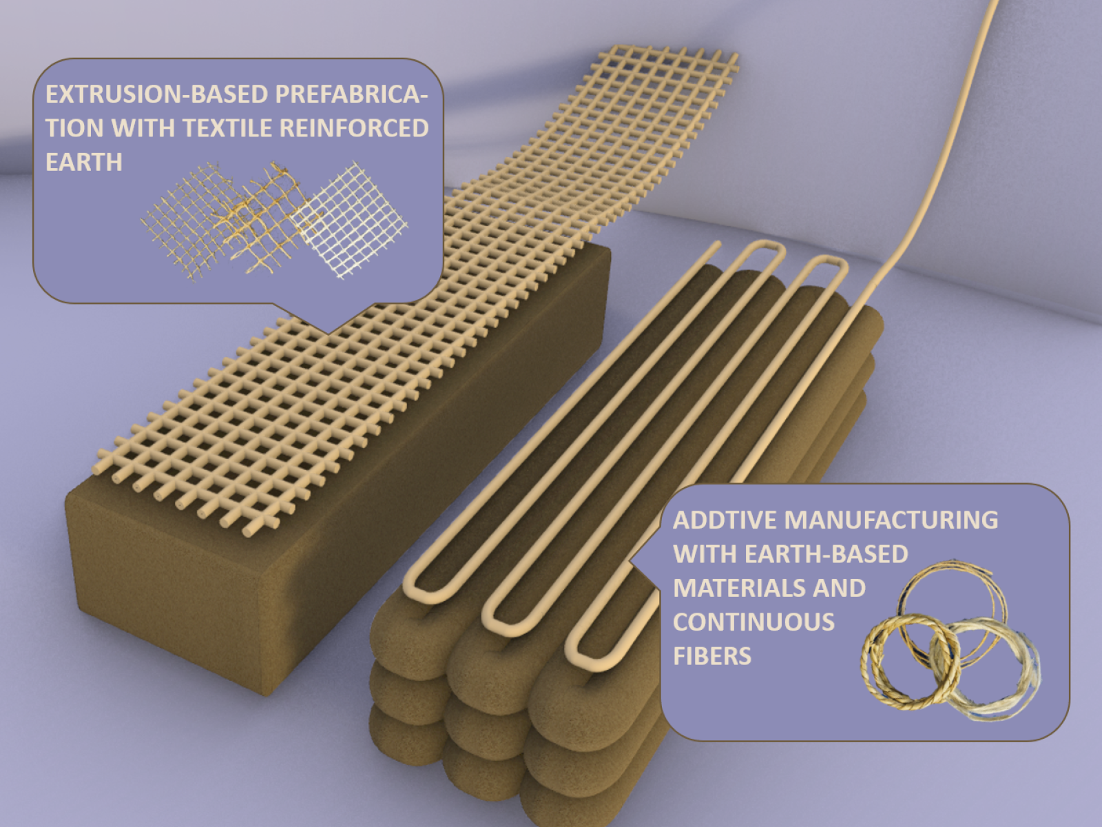 Multi-scale characterization quantifies earth-fiber interfaces, bonding mechanisms, and moisture transport. These results are linked to rheological properties that define process windows with respect to printability and extrudability. Mechanical performance is assessed from specimen to component scale and translated into design principles and calculation approaches. Natural additives are screened to enhance water resistance and fiber-matrix adhesion without compromising recyclability.